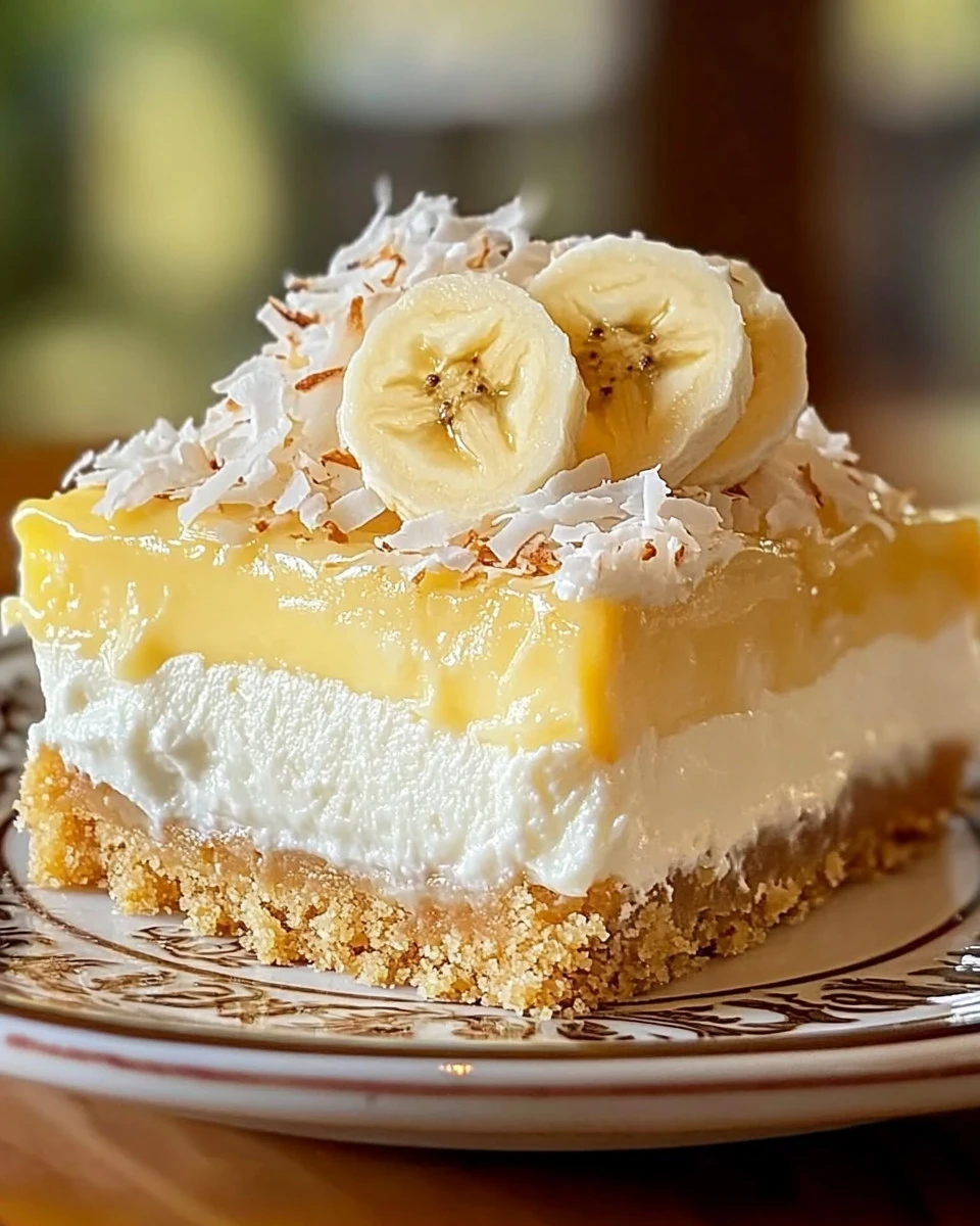 Einfach zuzubereitende, cremige Bananen-Pudding-Käsekuchen-Riegel, perfekt für schnelle Süßigkeiten und Kaffeepausen.