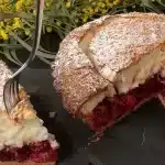 Lassen Sie den Kuchen abkühlen, bevor Sie ihn servieren. Dieser Kuchen kann auch mit frischen Kirschen zubereitet werden.