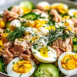 Eier-Gurken-Thunfischsalat – allein der Gedanke an diesen frischen, cremigen Salat bringt mich sofort zurück an die Sommertage meiner Kindheit. Ich erinnere mich noch genau an das leise Klirren der Schüsseln in Omas Küche und den Duft von frischem Dill, der über dem Tisch lag. Immer, wenn wir sonntags im Garten zusammensaßen, stand genau dieser Salat auf dem Tisch – einfach, ehrlich, unkompliziert. Der erste Bissen war für mich wie ein kleiner Kurzurlaub: Die Kombination aus saftiger Gurke, herzhaftem Thunfisch und dem zarten Aroma gekochter Eier ist für mich pure Nostalgie. Vielleicht kennst du Eier-Gurken-Thunfischsalat schon aus deiner Kindheit oder probierst ihn zum ersten Mal – eines kann ich dir versprechen: Dieses Rezept ist ein echtes Herzstück unter den schnellen Salaten.
