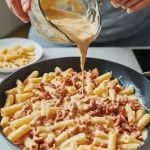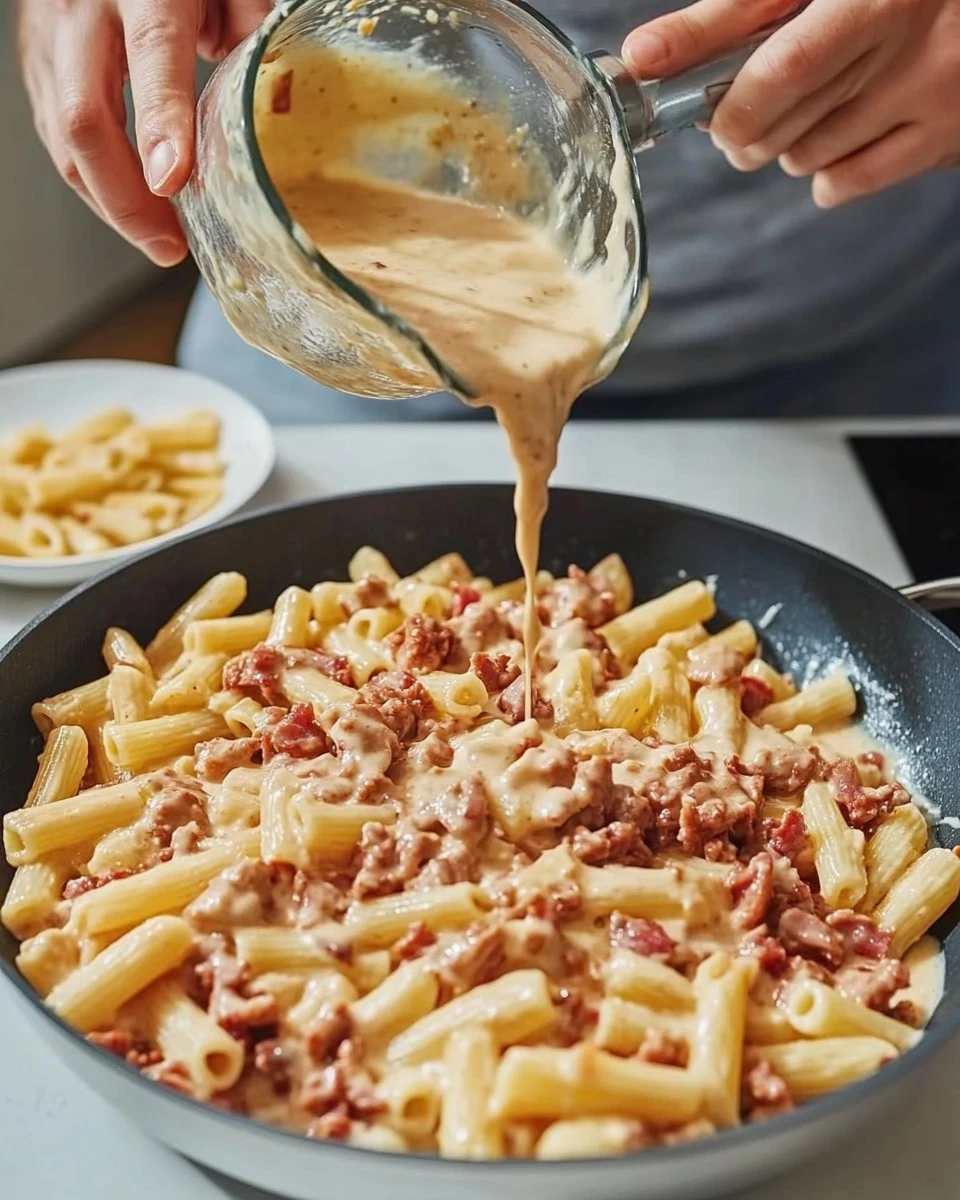 - Schmand unterrühren: Stell die Hitze etwas zurück und rühre den Schmand unter. Alles gut vermengen, bis eine cremige Soße entsteht. Wenn sie zu dick ist, misch 1–2 EL Nudelwasser dazu.